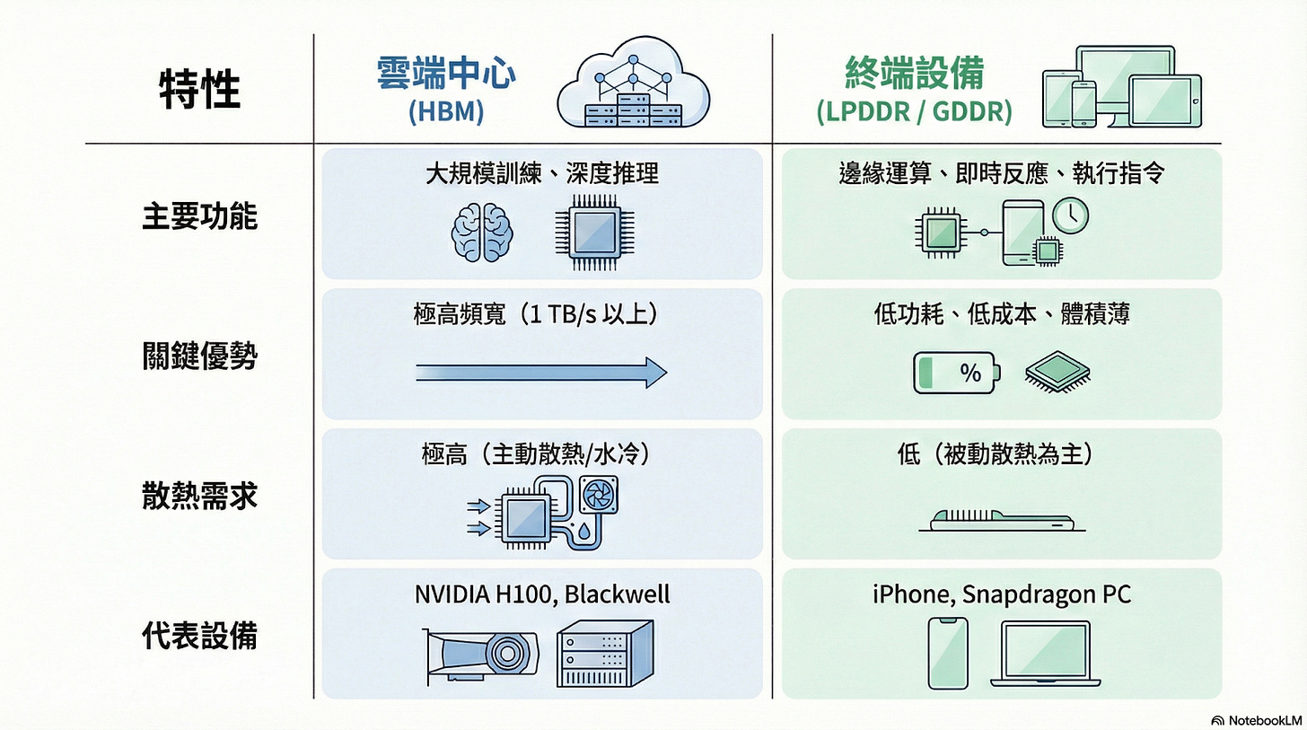 這樣的硬體落差,最終定義了兩套不同的演算法邏輯。雲端 HBM 支撐的是數據吞吐的持續擴展,而終端 LPDDR 則是挑戰在有限的記憶體容量內,透過模型量化與結構簡化,完成精準而即時的推理任務。